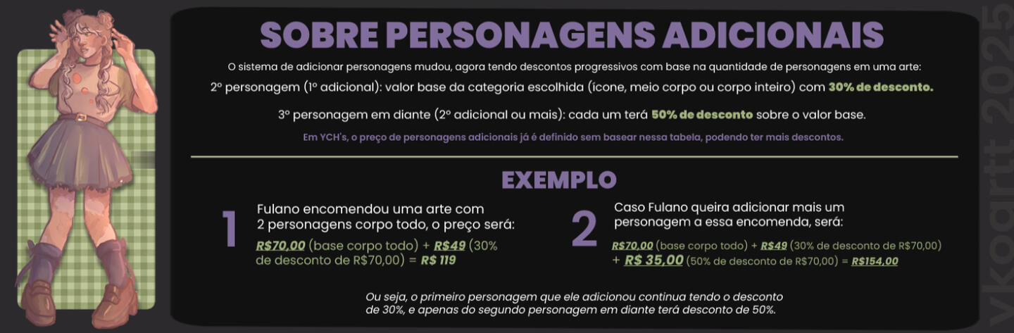 ✘ Qualquer coisa que me deixe desconfortável. (Conte-me sua ideia para que eu possa pensar sobre ela)→ Entre em contato e comunique sua ideia para que eu possa avaliarPAGAMENTOSApós negociar o preço, ofereço duas formas de pagamento:1 - 50% do valor antes de iniciar o desenho e 50% do valor após finalizar a arte (antes do envio).2 - 100% do valor no início do desenho.Não ofereço reembolsos, mas podemos negociar o valor em caso de urgência com comprovação.REVISÕES√ Haverá DOIS pontos de verificação durante o processo:- Sketch/Rabisco: Entregarei uma versão em esboço da arte. Você poderá alterar a expressão/algumas características principais do rascunho. Recomendo que você forneça uma referência caso queira fazer grandes alterações.- Colorido: Fornecerei uma versão colorida + arte finalizada, e você poderá alterar o que quiser (exceto a pose, pois isso deve ser decidido na fase de esboço simples).√ Por favor, junte todas as alterações que você deseja que eu faça em cada etapa. Será mais fácil para que eu altere e também será melhor para você receber um desenho alterado do que vários.√ Por favor, esteja ciente de que NÃO IREI alterar a pose na etapa de cor + arte de linha, nem na renderização/final.PRAZOS E ENTREGA√ Prometo entregar a arte final em no máximo 2 meses. Esse prazo pode muito bem variar caso a fila de encomendas esteja muito cheia, e caso ocorra, eu avisarei!